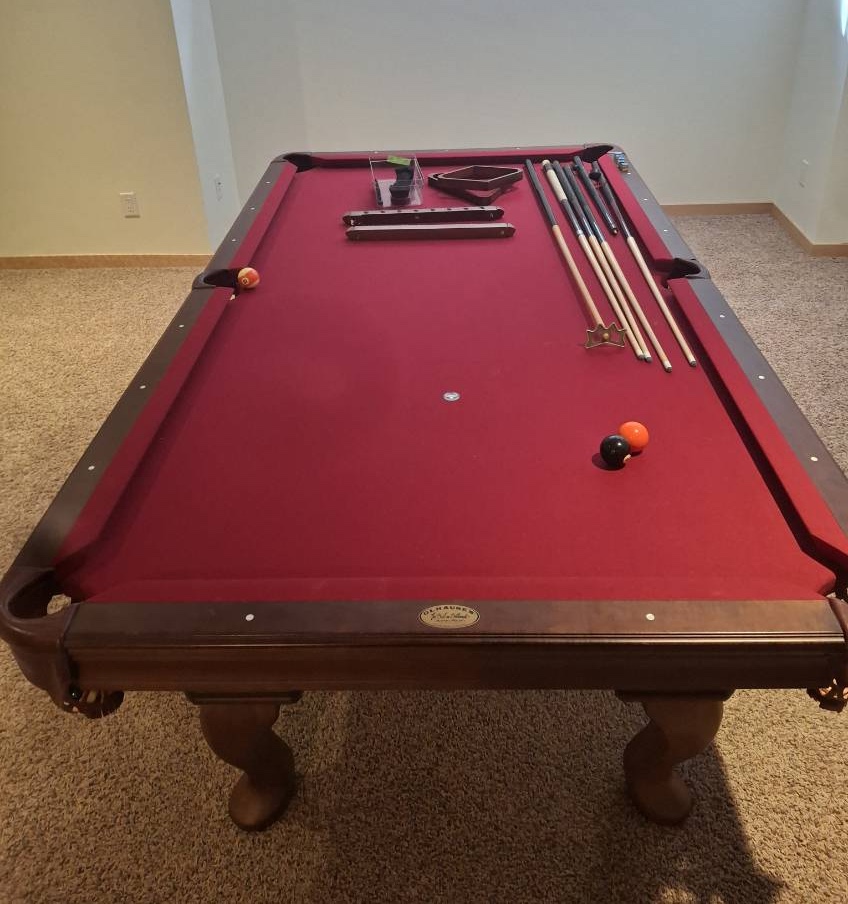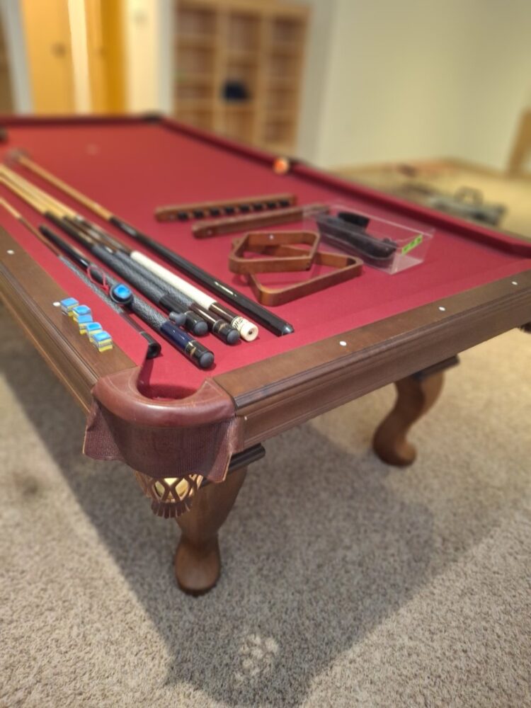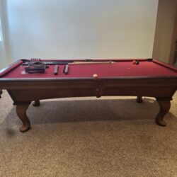 Beautiful 8ft Olhausen pool table with a stunning rich mahogany finish and elegant, fine-lined design, offering a high-end, furniture-style look with solid construction and excellent playability. Save thousands compared to buying new without compromising on quality!